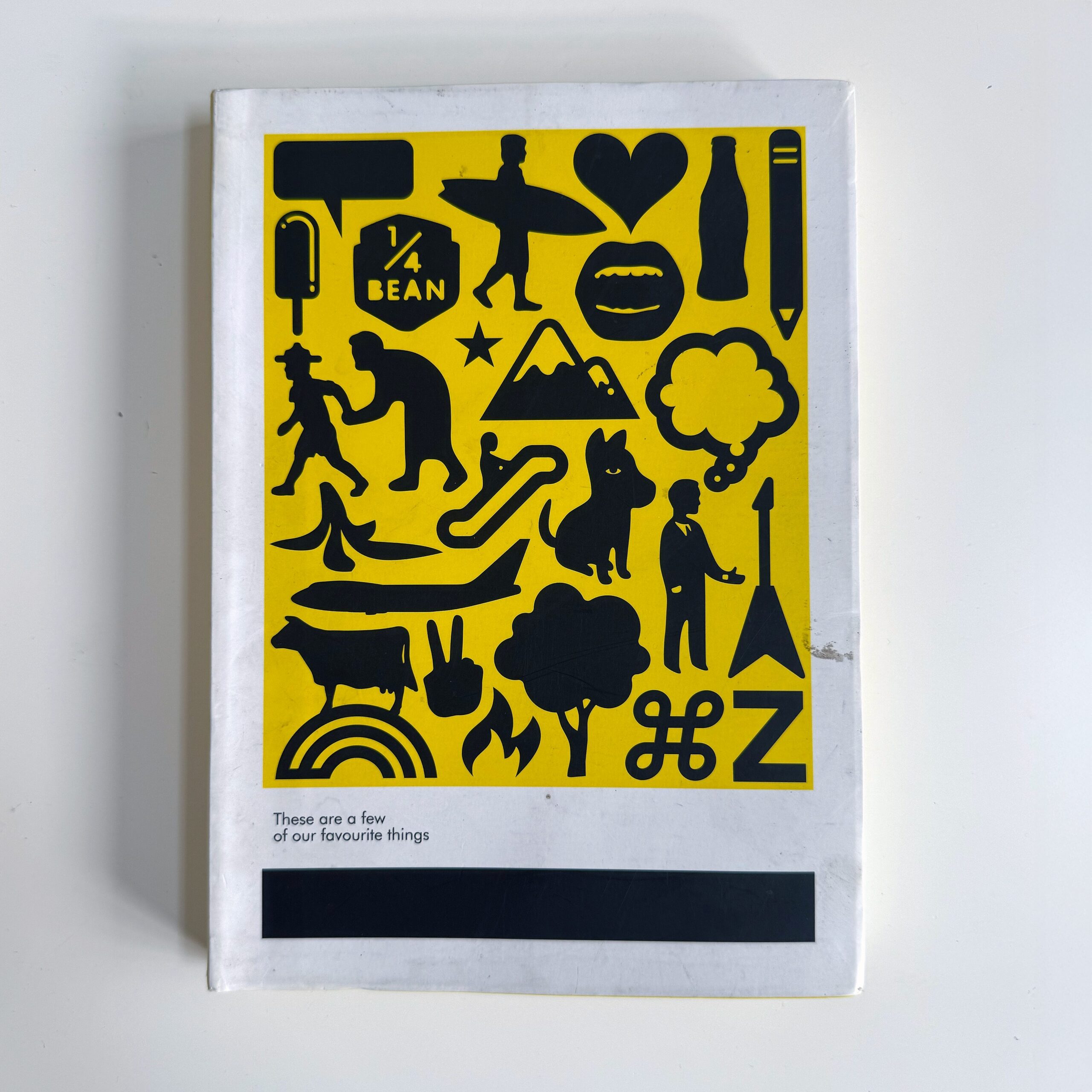 The cover features their signature “Black on Yellow” aesthetic, displaying a collection of silhouettes that capture the intersection of design culture and Durban life; featuring surfboards, the “1/4 Bean” coffee reference, and the universal designer’s savior: “Command Z” (Undo). The text reads: “These are a few of our favourite things.”