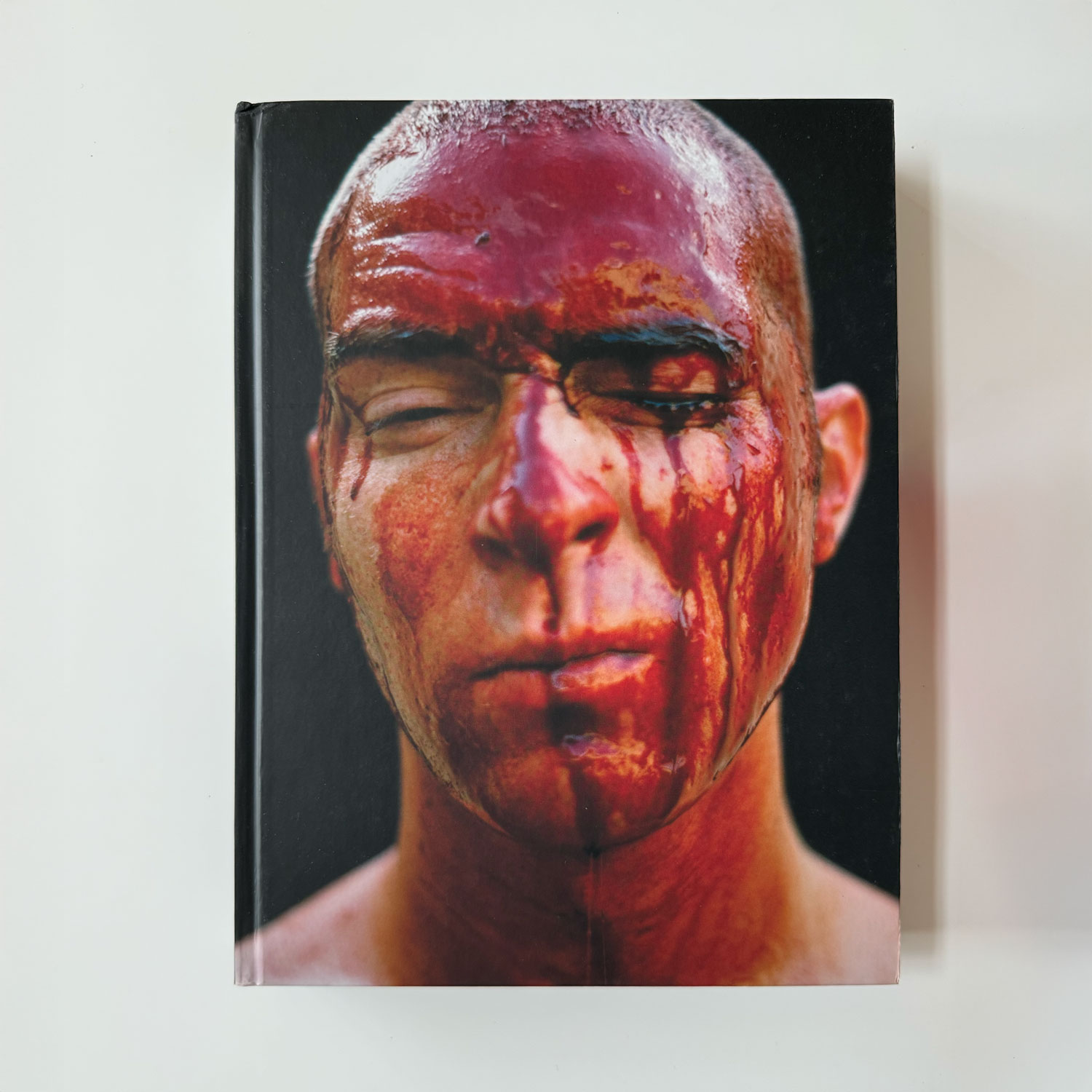 The object itself mirrors the work: stark typography, saturated red, a cover that reads like a warning sign. It doesn’t politely sit on a shelf, it stares back.